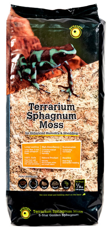 Galápagos 5-Star Golden Sphagnum is soft and fluffy golden moss that holds 20-times its dry weight in moisture. Its inherent fungicidal properties also help fight odors, fungal growth, and mite infestation in your terrarium. Use as a snake bedding or as a moist habitat for amphibians. Combine with other substrates to create the ideal humidity levels for tropical or wetland terrariums.